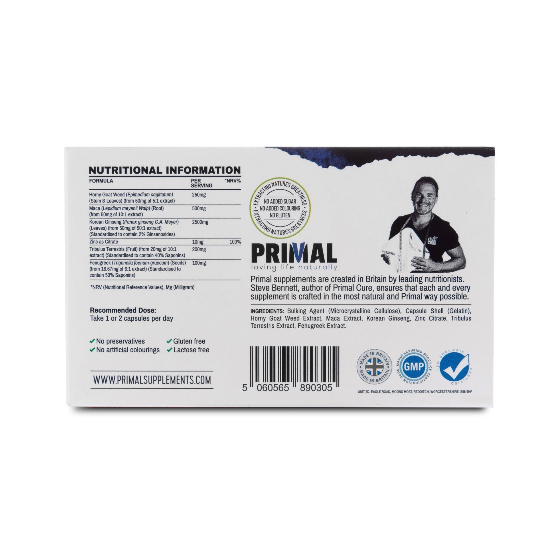 - A truly Primal formula made with all natural ingredients: Horny Goat Weed, Maca Root, Korean Ginseng, Tribulus & Fenugreek